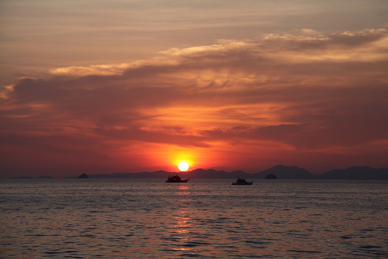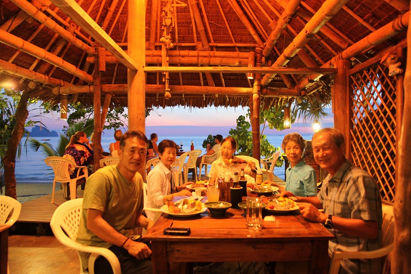 夕陽を眺めながらの新鮮なシーフードディナーをいただく