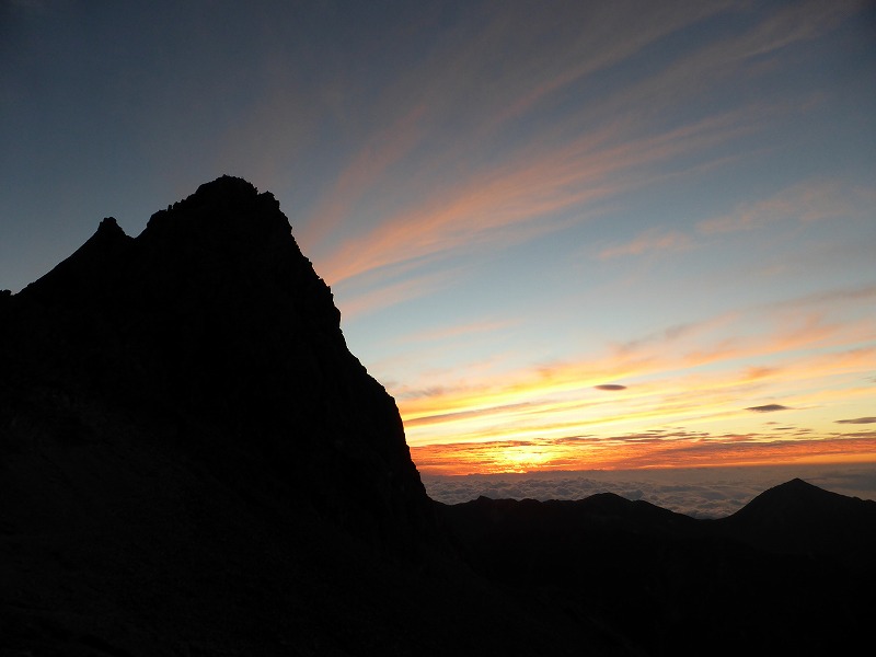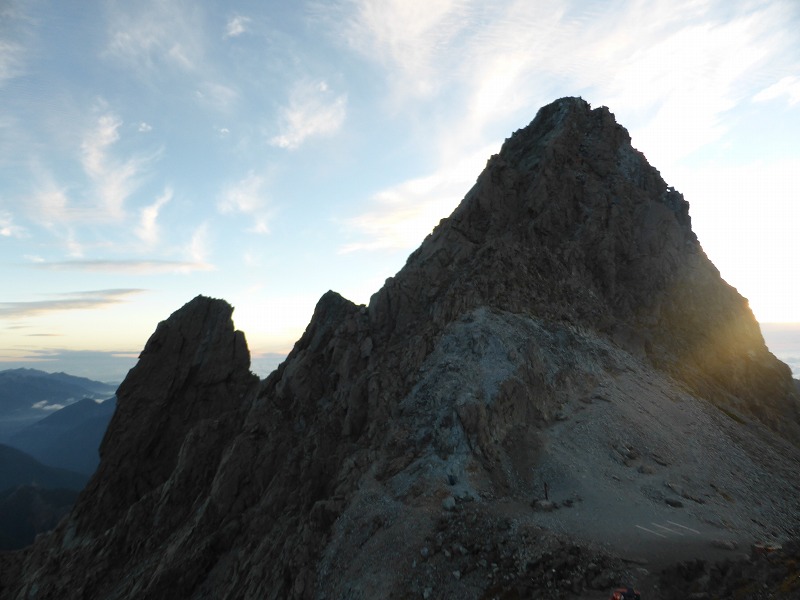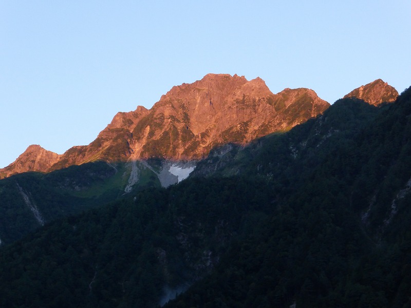 井上靖氏の小説「氷壁」の舞台となった前穂高岳東壁に朝日が当たります